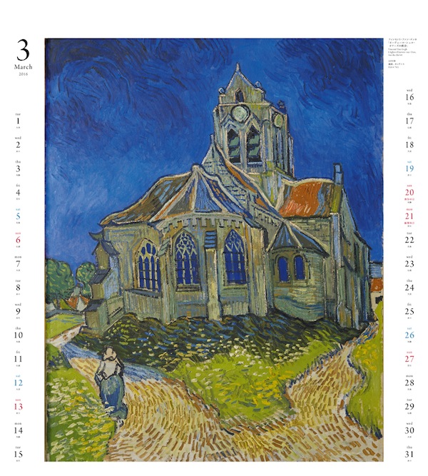 本製品は、本物の色、筆使いまでわかるほどの超高精細復元作品として、名画13点を500×450mmという迫力のサイズで組み込んだカレンダーだ。カレンダーの絵と言えども、リアルな絵画を眺めているようで、とくに「かささぎ」「昼食」「日傘の女(左向き)」(いずれもクロード・モネ)や「オーヴェール・シュル・オワーズの教会」(フィンセント・ファン・ゴッホ)、「レスタックから望むマルセイユ湾」(ポール・セザンヌ)などは、チューブ絵の具による凹凸を利用して試みたさまざまな表現を目で体感できる。カレンダー自体はごくシンプルで作品を際立たせるデザインとしており、インテリアとして飾るのも、とてもいい印象を受けるだろう。