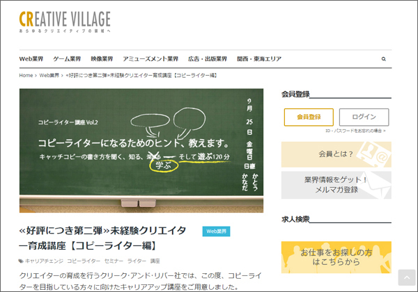 クリエイター育成を行っているクリーク・アンド・リバー社主催で行われる、現役で活躍するライターを講師に招いた人気の講座。講座では、コピーライティングの基礎から、応用として実践型のワークショップが行われる。コピーライター向けの内容にはなっているが、Web制作においても応用として役立つことも多い。いずれにしても、コピーライティングはWeb制作のひとつでもあるので、クリエイターとして知っておいて損はないだろう。