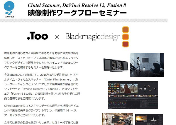 2015年8月に受注が開始されたブラックマジックデザイン社の、Cintel Film Scanner、映像関連ソフトのDaVinci Resolve 12 Studio、Fusion 8 Studioについてのワークフローを紹介するセミナー。セミナーにあたり、講師としてブラックマジックデザイン社も参加しているため、制作者側から導入や運用方法について直接聞くことができる。既に、利用されている方はもちろん、映像制作に携わっており、導入を検討している場合はぜひ参加しておきたい。