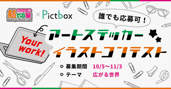 株式会社アイフリーク モバイルは、オリジナルの絵本/イラスト/スタンプ/マンガ/写真の投稿や閲覧を楽しめるオリジナル作品コミュニティ「Pictbox」にて、2015年10月5日(月)より「アートステッカーイラストコンテスト」を開始した。ステッカー専門サイトの「貼れる屋」を運営している越後札紙株式会社とのコラボレーション企画。「広がる世界」をテーマに、アートステッカーとしてノートパソコンを彩るイラストが募集されている。応募受付は2015年11月3日(火)まで。