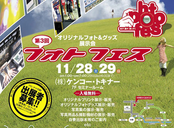 2015年11月28日(土)および29日(日)に、株式会社ケンコー・トキナー 7F セミナールームにて「オリジナルフォト&グッズ展示会 第三回フォトフェス」が開催される。大陽出版株式会社の主催/株式会社ケンコー・トキナーの共催による入場無料のイベントで、開催時間は13:00〜19:00(29日は18:00まで)。この展示会の開催にあたって、16歳以上の個人/グループ(プロ・アマ不問/20歳未満の申込では保護者の同意が必要)を対象に、会場で展示/販売を行うブース出展者の募集(申込書を郵送またはFAXで送付)が実施されている。