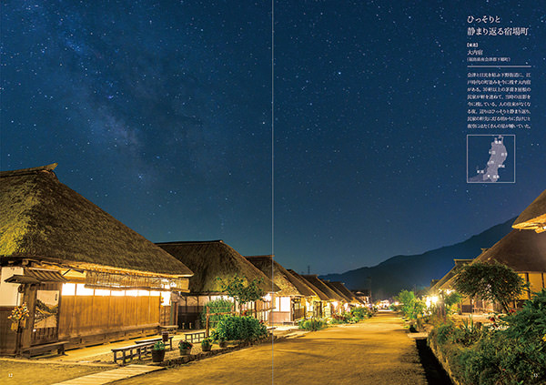 同氏による撮影は、2005年よりフィルムカメラからデジタルカメラへ移行。近年は、夜の自然風景をライフワークとして新たな魅力を見せている。本書では「僅かな星明りを浴びる御釜(蔵王御釜/宮城県刈田郡蔵王町)」「ひっそりと静まり返る宿場町(大内宿/福島県南会津郡下郷町)」「寂光に包まれた戸隠連山と鏡池(戸隠鏡池と天の川/長野県長野市)」「富士の頂に輝くパールムーン(逗子海岸/神奈川県逗子市)」「月夜の砂丘と水平線を彩る漁火(鳥取砂丘/鳥取県鳥取市)」など、各地の夜の自然風景が満載。