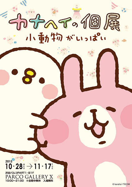 2015年10月28日(水)から11月17日(火)まで、渋谷パルコPART1・B1FのPARCO GALLERY Xにて「カナヘイの個展〜小動物がいっぱい〜」が開催される。入場無料、会期中無休で、時間は10:00〜21:00。LINEスタンプやマンガ連載、グッズ展開、企業広告など幅広く手掛けるイラストレーター/漫画家のカナヘイ氏による10年振りの個展となっている。