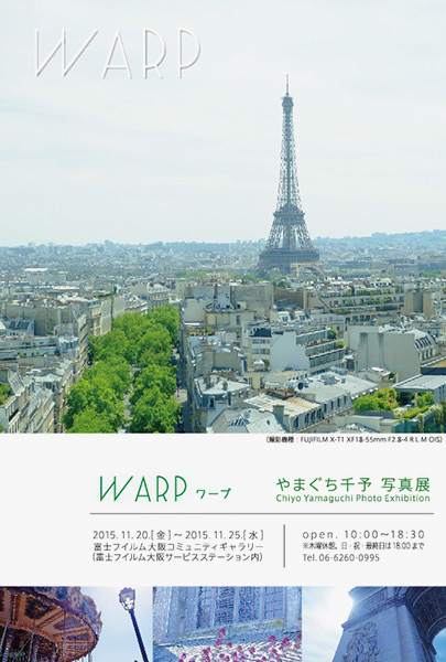 2015年11月20日(金)から11月25日(水)まで、富士フイルム大阪サービスステーション内 コミュニティギャラリーにて、やまぐち千予氏の写真展「WARP」が開催される。今夏にフランスで撮り下ろされた心象風景の作品展示で、展覧会タイトル通りにフランスへと“ワープ”したような気分に浸れる写真展。全紙サイズ6枚と半切サイズ10枚が展示される。入場無料、会期中無休で、時間は10:00~18:30(日曜/祝日/最終日は18:00まで)。