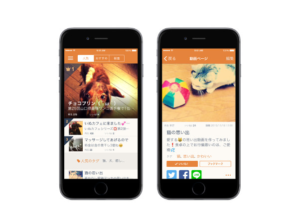 動画への導線としては、ランキングや新着リスト、好みのタグを探すための「タグリスト」などを活用することが可能。ユーザーの閲覧履歴から好みを学習し、アプリを起動すると瞬時に見たい動画だけを見られる機能も搭載しているため、「かわいい猫だけが見たい」「小型犬は好きだけれど大型犬は特に見なくていい」といった詳細なニーズにも応える。また、今回の「mofur」のリリースに合わせ、人気/注目動画のピックアップなどを実施してユーザー間の交流を手助けするための公式TwitterアカウントやFacebookページも開設された。なお、本アプリではTwitter/Facebook/LINEへのシェアも用意で、アプリを持っていないフォロワーにシェアした動画は、Webブラウザ上から閲覧してもらうこともできる。今後はAndroid版のリリースやiPad/タブレットへの最適化など、さらなる拡充が行われる予定。