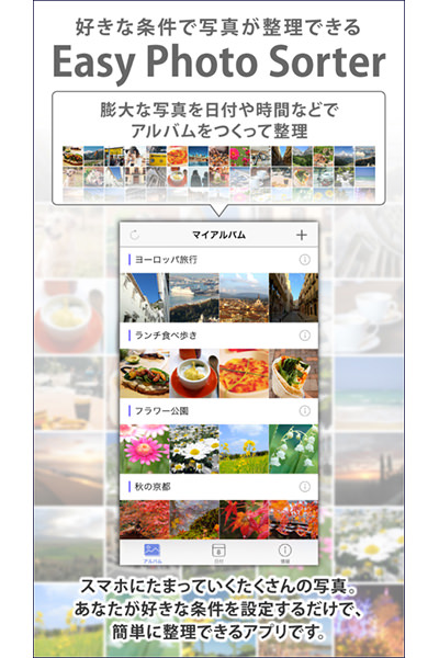 「Easy Photo Sorter」は大量の写真を整理するためのアプリ。日付や時間、曜日などの情報を組み合せて整理したい条件を設定すると、アプリ起動時にiPhone/iPadの写真アルバムの中にその条件でフォルダーが作成されて、自動で写真を整理することができる。