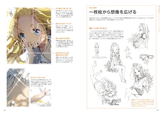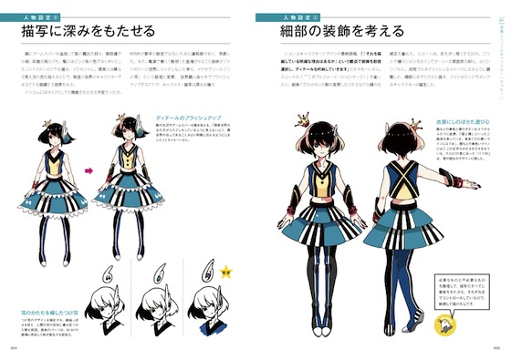 本書は、まさにキャラクターを描くうえでの基本から実践までを知り、学ぶための教科書である。キャラクターデザインの基礎知識からはじまり、プロの作家の実例をもとに「音楽ユニット」「カードバトル型RPG」「ゲーム」「コスプレ」「実体験」という5つのテーマに沿ってキャラクターを作り、一枚絵を描き上げるまでの手法を詳細解説する。デザインのコツや際立たせるにはどうするか? などリアル分析からくる説明は、非常にわかりやすいと言って良いだろう。