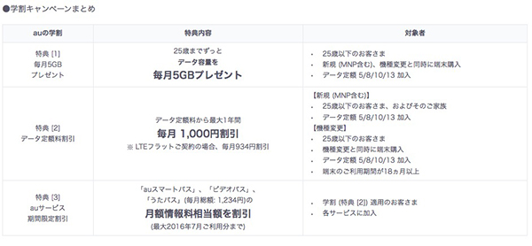 携帯各社の学生世代への特典が過熱、auは25歳以下に5GBプレゼント