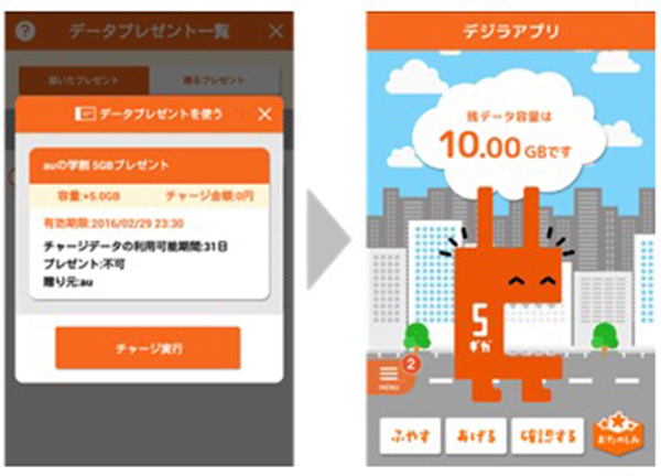 今回の発表で、データ定額プランで5GB以上のプランを選択している学生世代のユーザーは、最低でも毎月10GB利用できるようになった。auでは13歳~25歳 (学生世代)のデータ利用量の平均が5.3GBで増加傾向にあるとし、データ容量を気にすることなくスマートフォンを楽しんで欲しいとしている。5GBプレゼントの対象者は、25歳以下・新規 (MNP含む)、機種変更と同時に端末購入・データ定額 5/8/10/13 加入が条件となる。