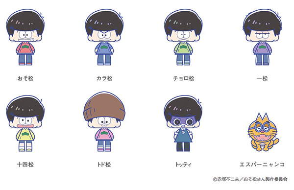 また、「こえだらいずR ラバーストラップコレクション」にも「おそ松さん」が追加された。こちらは価格500円(税抜)で、4月下旬からの発売開始。前述の6つ子に「トッティ」「エスパーニャンコ」がプラスされている。