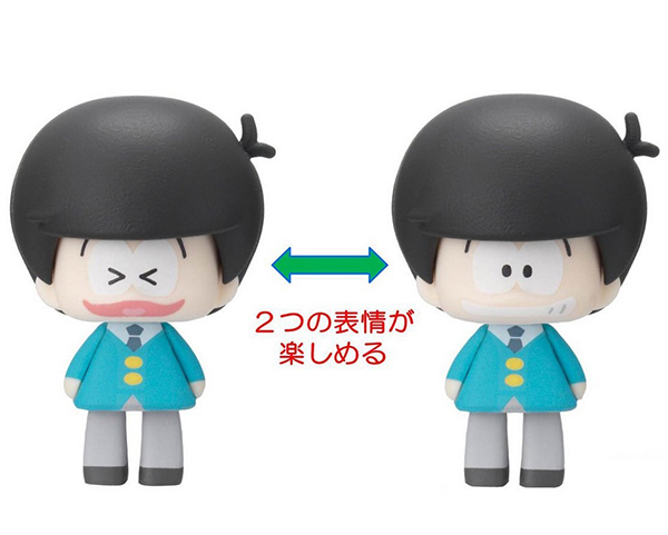 種類は「おそ松」「カラ松」「チョロ松」「一松」「十四松」「トド松」の全6種類。フィギュア1体と台座1個がセットになっていて、表と裏で異なる表情の顔パーツとなり、表情を変えることもできる。策士的な「カラ松」、ちょっと困った顔の「チョロ松」、眠たげな「一松」など、キャラクターの特徴をとらえた表情だ。