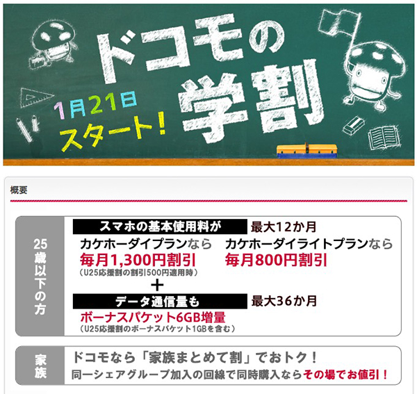 株式会社NTTドコモ(docomo)は14日、ソフトバンクやauに続き、25歳以下のユーザーを対象にした学割キャンペーン「ドコモの学割」を発表した。これで主要携帯キャリア3社の学割キャンペーンが出揃った。