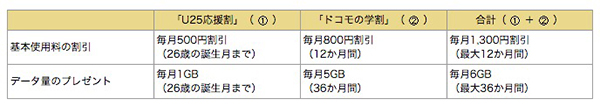 「ドコモの学割」は、「U25応援割」と併せて利用することで、家族で分け合えるデータ容量を毎月6GB(最大36ヶ月)プレゼントするキャンペーン。内訳は、「U25応援割」で1GB、「ドコモの学割」で5GBとなっている。また、容量プレゼントだけではなく、基本使用料も毎月1300円(「U25応援割」500円・「ドコモの学割」800円※カケホーダイプランの場合)割引となる。