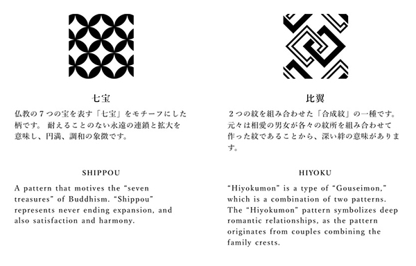 また、円満、調和を表す「七宝」と、相愛の意味を持つ「比翼紋」を組み合わせたものなど、あらかじめ決められた柄を組み合わせたお守りも購入できる。価格は1500円(税・国内送料込)。