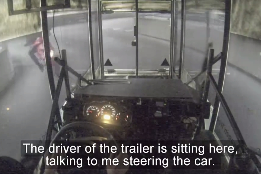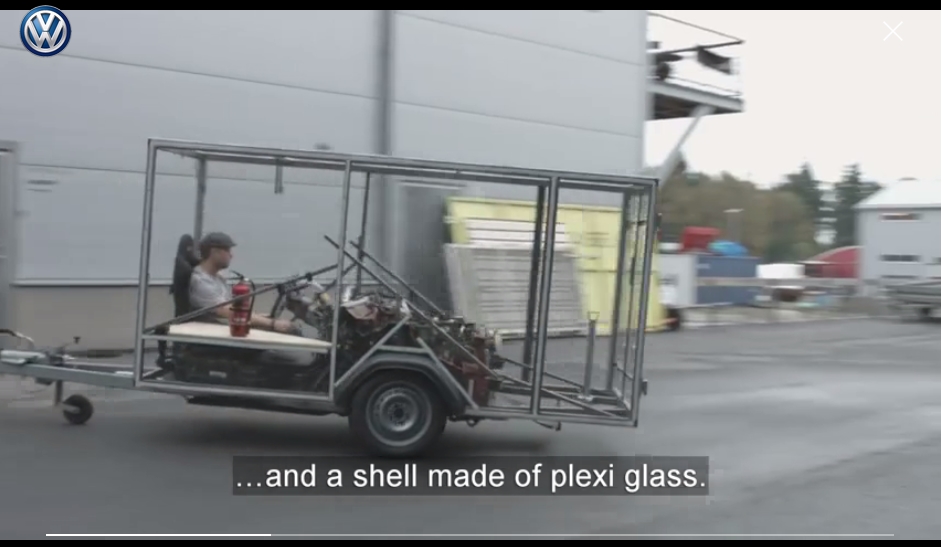 日本ではお色気満載のDMMのマジックミラー号が有名だが、フォルクスワーゲンのマジックミラー号はその技術力をアピールするためのもの。動画では、小さな車を裁断してパーツにする様子や透明なプラスチックで作られたフレーム、真っ直ぐ走らせる難しさなどについて語られている。しかし、まったく挙動の読めないコンテナがバックで迫ってくる様子は危ないデザインであり、動画内では慌てて避けるバイクの様子も写っている。