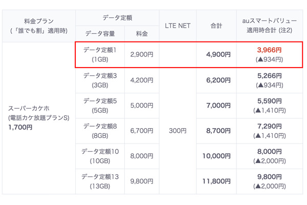 同サービスの料金は料金は月額2900円(税抜)。これにより、データ通信の利用が少ないユーザーの場合、auスマートフォンを月額4900円(税抜)で利用可能となる。また、「auスマートバリュー」を適用すると、最大2年間、月額934円(税抜)が割引となり、月額3966円で利用可能となる。