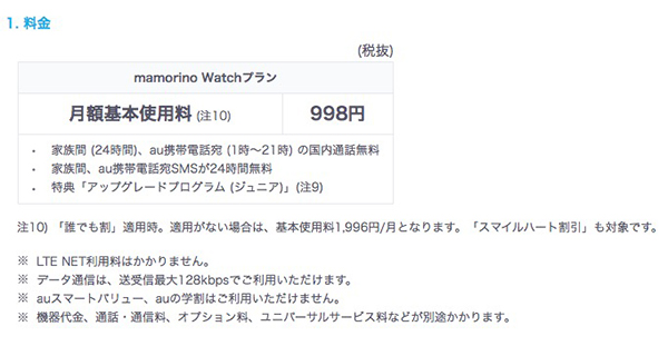 料金プランは、家族間ならば国内通話/国内SMSともに24時間無料な「mamorino Watchプラン」を月額基本料998円で用意。