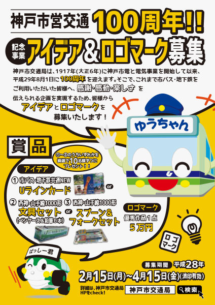 神戸市交通局は、1917年(大正6年)に神戸市電と電気事業を開始してから、2017年8月1日(火)で100周年を迎える。これを祝し、これまでの市バスや地下鉄の利用者へ「感謝」「感動」「楽しさ」を伝えるための記念事業にあたり、アイデアとロゴマークを募集中。2016年4月15日(金)まで、応募を受け付けている。