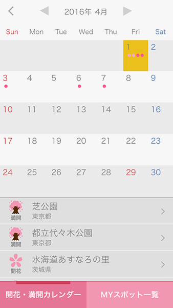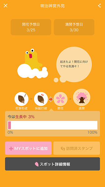また、名所に近付くと知らせてもらえる「桜スポット接近通知」が搭載されていることも特徴。通知範囲は約500m / 約1km / 約3kmから選択でき、開花予想日や生長状態がプッシュ通知される。そのほか、「開花・満開カレンダー」では、お気に入りのスポットを「MYスポット」として追加すると、開花 / 満開の予想日をカレンダーで見ることが可能だ。さらに、訪問した“桜スポット”に「訪問済スタンプ」を押せるスタンプラリー機能も用意されており、さまざまな方法で桜の季節を楽しむことができる。