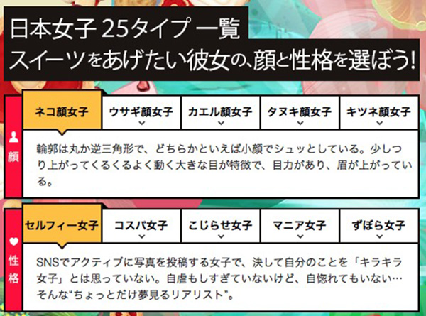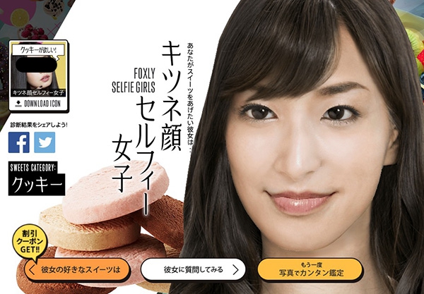 本サイトは、日本人の女子の顔を25パターンに分類し、お返しを贈る相手の顔を選ぶとどのようなスイーツが適しているかを教えてくれる顔診断サイト。女子の顔は「ネコ顔女子」「ウサギ顔女子」など5タイプ、性格は「セルフィー女子」「コスパ女子」など5タイプに分かれ、組み合わせで25タイプとなっている。例えば、お返しをあげる女子のタイプが「タヌキ顔こじらせ女子」だとすると、あげるべきスイーツは「ラスク」と表示され、そのままYahoo!ショッピングで購入することもできる。
