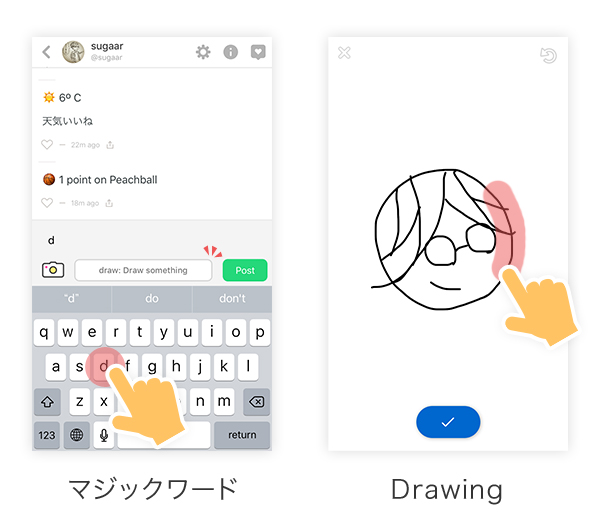 上の図は自分のポストが並ぶフィード画面だが、下部のフォームからつぶやき入力時に、マジックワードの頭文字にあたるアルファベットが入力された際に、中央にコマンドの候補が出現する。上のサンプルでは「d」を入力し、「draw : Draw something」のコマンドを使用した例であるが、これ以外にもGIF画像を投稿したり今日の天気を投稿するものや、ミニゲームが起動するコマンドなどが用意されている。