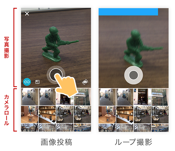 つぶやき投稿の際、カメラアイコンをタップすると写真投稿の画面へと遷移する。ここではカメラロールから写真を選択したり、その場で撮影することもできるが、画面左のアイコンをオンにして撮影すると、コマ撮りアニメのようなループする動画が撮影できる。この機能自体はよくあるものだが、画面を構成するUIに余分な要素がなく、1画面で「写真撮影」と「カメラロール」をシームレスに選択できるので画像の投稿に対する障壁が少なく、非常にライトに投稿を完了することができる。