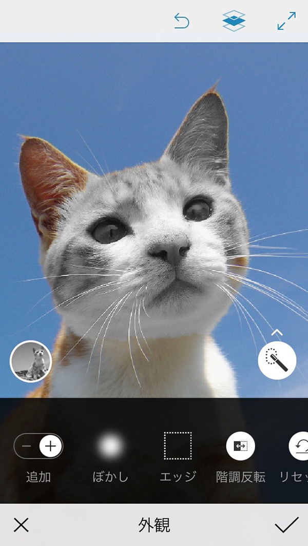 切り抜き対象を選択し終えたら、下部のメニューから「階調反転」をセレクト。すると、切り抜きたい部分がカラー、その他がモノクロになり、わかりやすくなる。作業完了ならば✓を押す。これにより、猫だけがカラー、背景はモノクロという印象的な画像ができあがる。これだけでもインパクト十分なのだが、ここから、この画像をつかって猫だけを取りだした切り抜き画像を作成する。