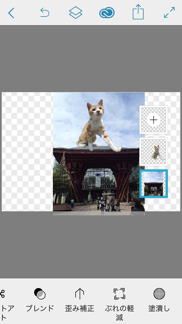 「切り抜き」は下部メニューから「カットアウト」を選択し、切り抜きたい部分を指でなぞって選択していく。さきほど切り抜き部分とそれ以外を色分けしているので、スムーズに指定ができるはずだ。指定が終わったら右下の✓を押せば完了する。他の画像との合成は、その画面から作業を続行できる。右中部の+をタップすると最初と同じ画像選択画面になるので、ここでは以前に撮影した金沢駅の鼓門をセレクトしてみた。