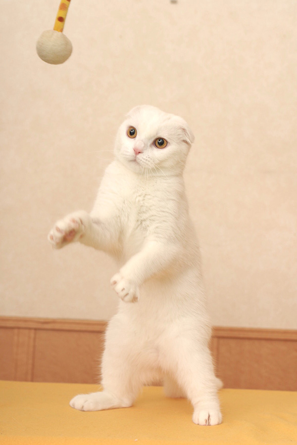 リラックス状態の猫にモテつつ、おもちゃで遊びつつ撮影するテクニック。まずは、片手におもちゃ、片手にスマホで撮影するスタイル。片手で撮影できるスマホならではの撮影法だ。この場合、スティックの先におもちゃがぶら下がっているタイプがグッド。頭上でプラプラするおもちゃを見上げる猫を上から撮れば、集中するキリリとした顔が撮れるし、躍動感に溢れるジャンプシーンも撮れる。また、この時、猫撮影の定番である「まねき猫のポーズ」が撮れることもある。