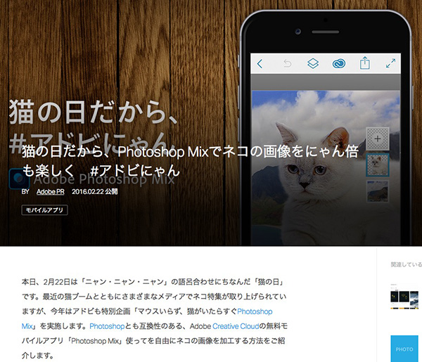 猫&「Photoshop Mix」の組み合わせに限らず、様々な使い勝手が想定される無料の合成特化アプリ「Photoshop Mix」。2月22日〜3月6日には「Photoshop Mix」を使って加工した画像を、「#アドビにゃん」付きでTwitterにあげると、抽選で22名にオリジナルトートバッグをプレゼントするキャンペーンを展開するので、猫写真と合成の腕試しに、応募してみてはどうだろうか。