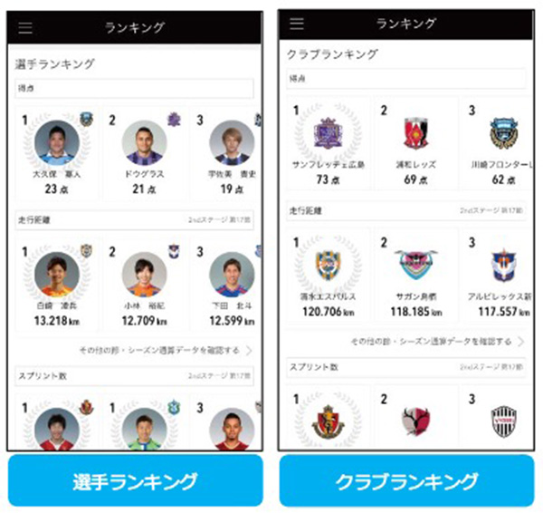 ランキング機能に関しては、新たに「得点」「シュート成功率」「パス成功率」「セ―ブ率」の4項目を追加し、応援しているチームに特化したランキング表示も可能になっている。また、「得点ランキング」にはゴールシーンリプレイ動画へのリンク機能を搭載し、見たいゴールシーンをすぐに見られるようになっている。
