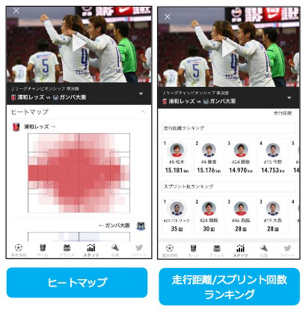 ほかにも、「ハイライト動画」の無料配信、選手名鑑に走行距離・スプリント回数・得点・シュート成功率・パス成功率・セーブ率の6つのトラッキングデータを追加している。