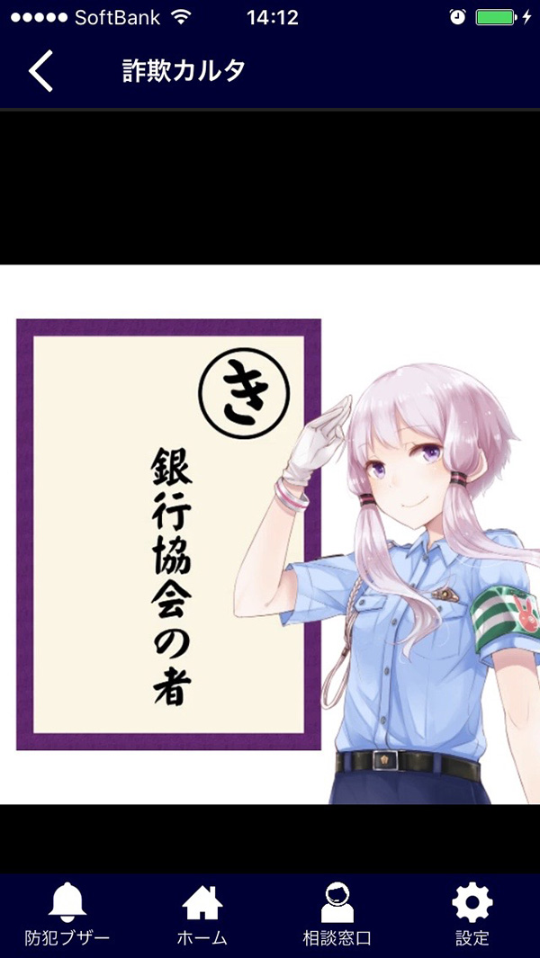 娯楽面では、キャラクターをふんだんに使用。警視庁公認のオレオレ詐欺防止キャラクター「テワタサナイーヌ」は、アプリの壁紙に設定したり、写真の好きな場所に好きな大きさのテワタサナイーヌを入れて撮影できる「テワショット」機能も搭載している。また、VOCALOIDイメージキャラクター結月ゆかりは、狼と香辛料などのイラストレーター文倉十による描き下ろしで登場。詐欺の手口をモチーフにした「詐欺カルタ」を、女性警察官の制服姿で読み上げる。なお、結月ゆかりの姿は、上半身だけ、全身、帽子ありなしなど、複数バージョンが存在する。