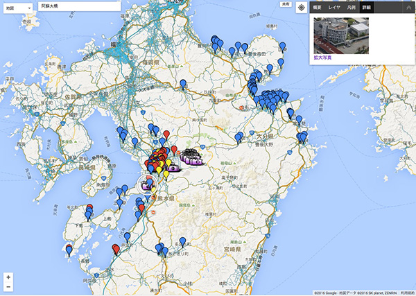 今回「災害情報マップ」に追加されたのは、熊本市街や南阿蘇村周辺などの上空写真。マップにあるカメラアイコンをクリックすると、瓦が崩落している熊本城天守閣の様子や土砂崩れで崩落した阿蘇大橋周辺、3階と4階部分が大きく損壊している宇土市役所の鮮明な写真を見ることができる。