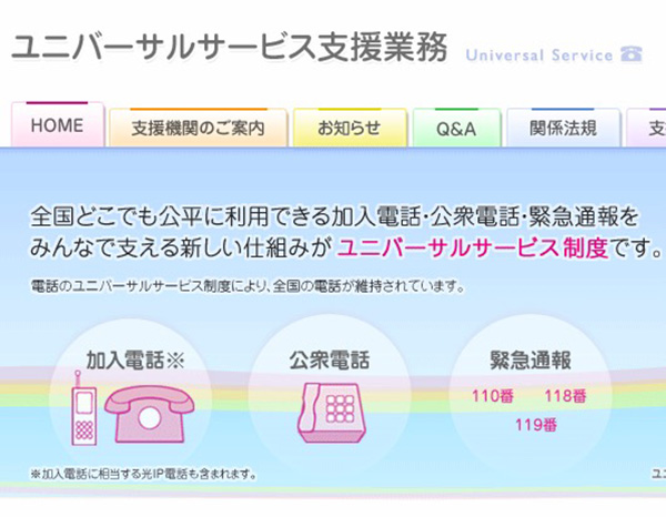 「ユニバーサルサービス制度」とは、加入電話・公衆電話・緊急通報(110番・118番・119番)などの誰もが利用できる電話サービスの、維持などに必要な費用を電話会社約30社が協力して負担するもの。