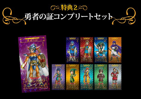 先行体験は、チケット自体が豪華仕様。厚みがあり、キラキラと光るメタルスライムがシルバーメタリックの特殊印刷でデザインされている。特典2としては、初代のドラゴンクエストからⅩまでの主人公をプリントした「勇者の証」のコンプリートセットがプレゼントされる。