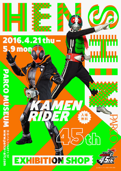 2016年4月21日(木)から5月9日(月)まで、渋谷パルコPART1・3FのPARCO MUSEUMにて、「KAMEN RIDER 45th EXHIBITION SHOP」が開催される。特撮ヒーロー「仮面ライダー」の45周年を記念して、期間限定でオープンするエキシビションショップ。日本のヒーローの歴史を変えた「仮面ライダー」の45周年の軌跡が、各種の展示とスペシャルアイテムで辿られる。入場無料で、開催時間は10:00〜21:00(最終日は18:00閉場)。