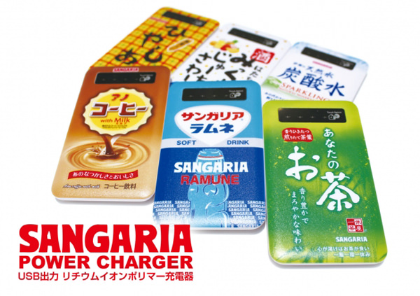 両製品は、清涼飲料水のSANGARIA(サンガリア)のデザインが描かれたiPhoneケースとモバイルバッテリー。「みっくちゅじゅーちゅ」「サンガリア ラムネ」「あなたのお茶」「アノコーヒー」「あめゆ」「ミラクルボディV」など全10種類のデザインを用意している。