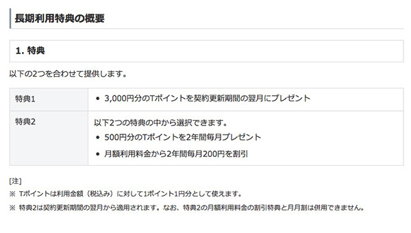 本キャンペーンは、2つの特典からなる長期利用特典。1つめは3000円分のTポイントを契約更新期間の翌月にプレゼント。2つめは「500円分のTポイントを2年間毎月プレゼント」か「月額利用料金から2年間毎月200円を割引」のどちらかから1つを選ぶ。最大1万5000円分のTポイントを選ぶか、Tポイント3000円プラス月額利用料4800円割引が選べるというシステムだ。