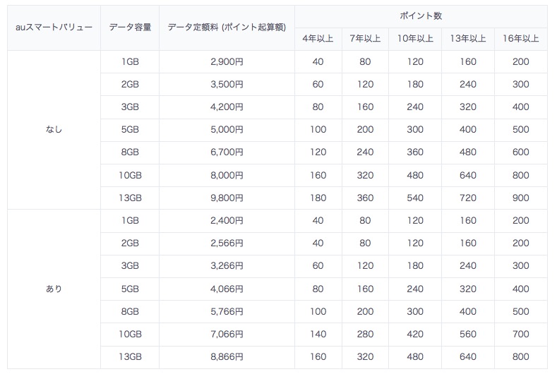 これは、4年以上auを利用しているユーザーに対し、契約しているデータ定額料金1000円ごとに「WALLET ポイント」を毎月プレゼントするもの。契約年数によってプレゼントされるポイント数が異なり、例えばデータ定額料1000円の場合、4年以上7年未満のユーザーは20ポイント、16年以上で100ポイントとなる。