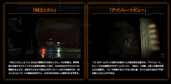 ゲームとしては、主観視点に大胆な変化を遂げた「アイソレートビュー」を採用。FPSのように主人公の視点で楽しめる。また、物の質感や空気中のホコリなどのディティールまで実写映画並に忠実に描く「REエンジン」によって、ゲームの世界への没入感が味わえる。