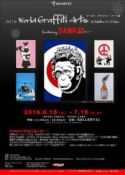 2016年6月18日(土)から7月18日(月)まで、GALLERY21にて、グラフィティアート展「2016 World Graffiti Arts Exhibition in Daiba featuring BANKSY」が開催される。昨年に引き続き、第2回目の開催。SNSの情報拡散などにより、世界で注目を集めているBANKSY、D*FACE、DOLK、Mr.Brainwash、Shepard Faireyなどによる約40作品が展示販売される。入場無料、月曜休催(祝祭日を除く)で、時間は11:00〜18:00。