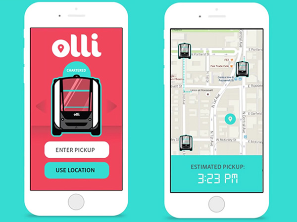 「Olli」はスマートフォンとも連携し、地図上で「Olli」の位置が記され、ピックアップの予定時刻もわかる。また、アプリを使って「Olli」を呼び出すことも出来る。