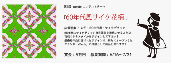 株式会社イチオクが運営するテキスタイルデザイン専門コンテストサイト「atelier circus(アトリエサーカス)」にて、新たなアパレルブランド「ellerie(エルリエ)」からの公募が開始された。2016年7月31日(日)まで、「60年代サイケ風花柄」をテーマにテキスタイルデザインを募集。入賞作品には賞金が贈られるほか、実際に洋服や雑貨などの身近な形となって「ellerie」から商品化される。