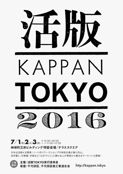活版TOKYO実行委員会は、2016年7月1日(金)から3日間にわたり、「活版TOKYO2016」を開催する。神保町三井ビルディングとテラススクエアの計2会場での開催。活版印刷を身近なものとして提案するイベントで、表現の幅を広げられるツールとしての認識を広めることを目指している。入場無料、雨天決行で、時間は初日が12:00〜20:00 / 2日目および3日目が11:00〜17:00。