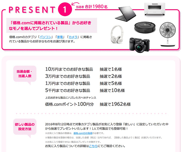今回、累計クチコミ投稿件数2000万件突破を記念して、「クチコミ掲示板2,000万件突破 ありがとうキャンペーン」を開催(7月4日〜8月3日)。アンケートに答えて「価格.com」掲載の製品をお気に入り登録&「欲しい」ボタンを押すことで、10万円までの好きな製品1名を始めとする賞品が合計2000名にプレゼントされる。