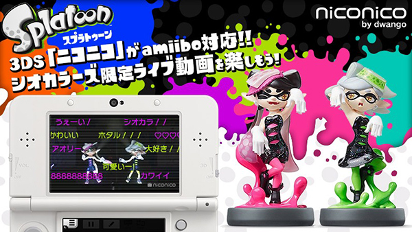 今回のアップデートを記念して、amiiboとのコラボ企画も実施。Wii U専用ソフト「Splatoon(スプラトゥーン)」の人気キャラクター・アオリとホタルの「amiibo」をニンテンドー3DSにタッチすれば、ニコニコ超会議2016内で開催された「シオカライブ」の特別仕様映像を楽しめる。また、amiiboの種類に応じてコメントの色が限定色に変化するという楽しみもある。