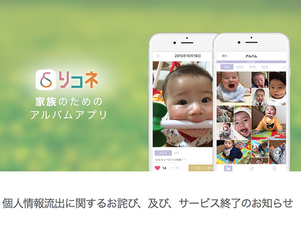 株式会社BookLiveは、同社が運営する家族のためのアルバムアプリ「リコネ」について、個人情報流出とそれによりサービスを終了すると発表した。