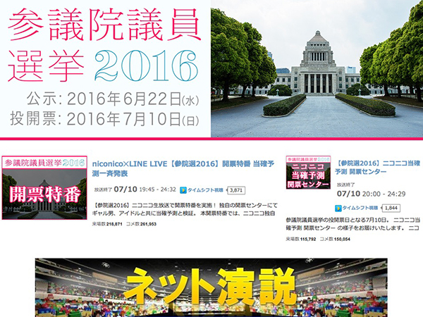 今回の参議院選挙では、ニコニコは独自の開票センターを設置し、Webアンケートによる意識調査結果に独自の分析を加えた全121議席の当確予測を実施。投票終了直後の午後8時には「自民単独過半数届かず、改憲勢力3分の2獲得へ」と報じたが、それが的中することとなった。