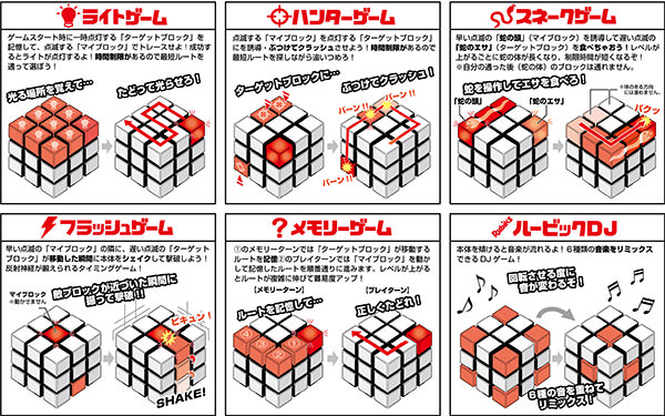 本製品は、見た目は「ルービックキューブ」のようでありながらも、従来とは全く新しい遊び方を楽しむ“新感覚キューブ”だ。ジャイロコントロールで赤い光は常に上方向に動き、本体をクルクルと傾けて光るブロックを目標の位置まで動かしながら遊ぶ。プレイできるゲームは、ライトゲーム / ハンターゲーム / スネークゲーム / フラッシュゲーム / メモリーゲーム / ルービックDJの6種。たとえばライトゲームでは、スタート時に一時点灯するターゲットブロックを記憶し、プレーヤーが操作できるマイブロックを動かして制限時間内にトレースする。